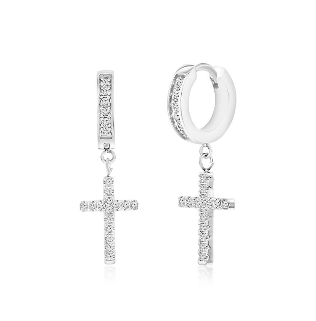 Cubic Zirconia Cross Dangle Huggie Hoop Earrings in Solid Sterling Silver with 14K Gold Plate