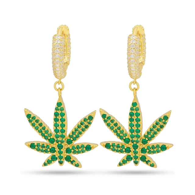 CZ Iced Weed Leaf Dangle Hoop Earrings