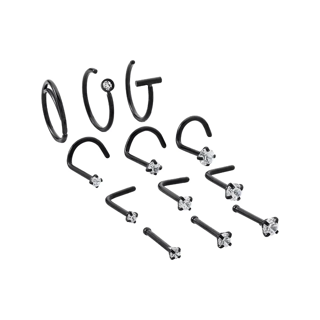 Multi-Pack Black CZ Nose Hoops and Pins 12 Pack - 20 Gauge