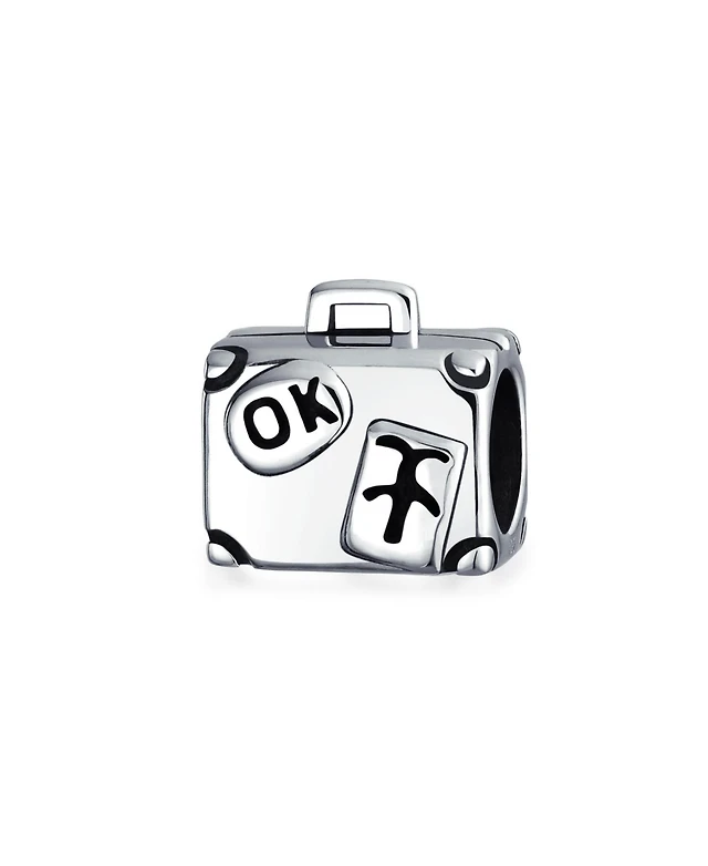 Bling Jewelry Vacation Tourism Travel Suitcase Luggage Charm Bead Oxidized .925 Sterling Silver