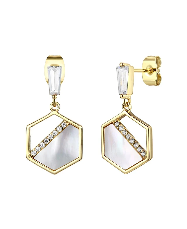 Sterling Silver 14k Gold Plated with Mother of Pearl & Cubic Zirconia Hexagon Dangle Earrings
