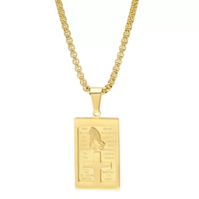Men's 18k gold plated stainless steel rounded box chain necklace with Serenity prayer plate and prayer hands pendant