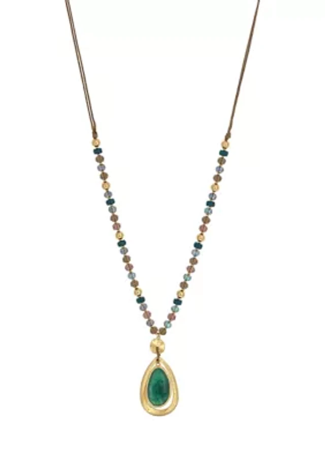 Gold Tone Multi Colored Beaded Long with Orbital Green Stone Pendant Drop Necklace