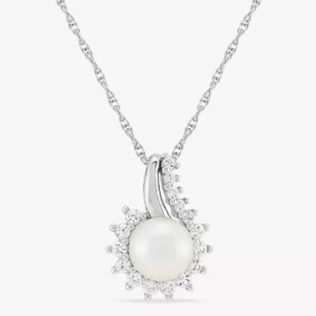 Silver Over Brass Cultured Freshwater Pearl and Cubic Zirconia Bridal Pendant Necklace