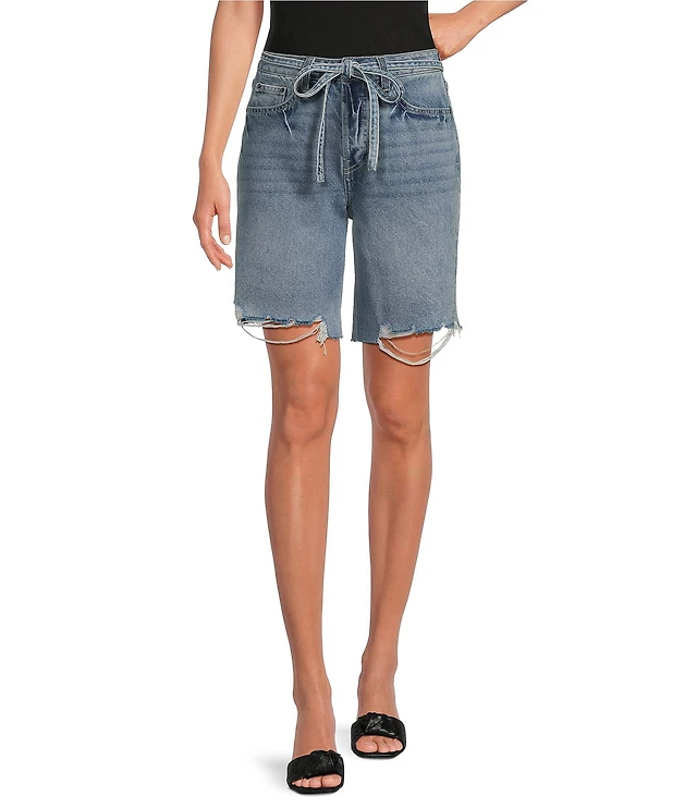 Le' AL.X Washed Woven Denim Mid Rise Tie Waist Distressed Bermuda Jean Shorts