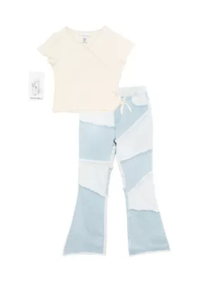Girls 7-16 Ribbed V-Neck Top and Patchwork Flare Jeans with Accessory