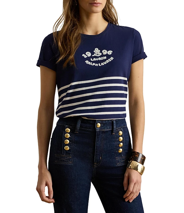 Lauren Ralph Lauren Stripe Embroidered Logo Jersey Tee