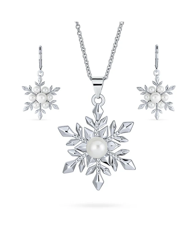 Holiday Party Christmas White Simulated Pearl Snowflake Necklace Pendant Dangling Earrings Jewelry Set For Women