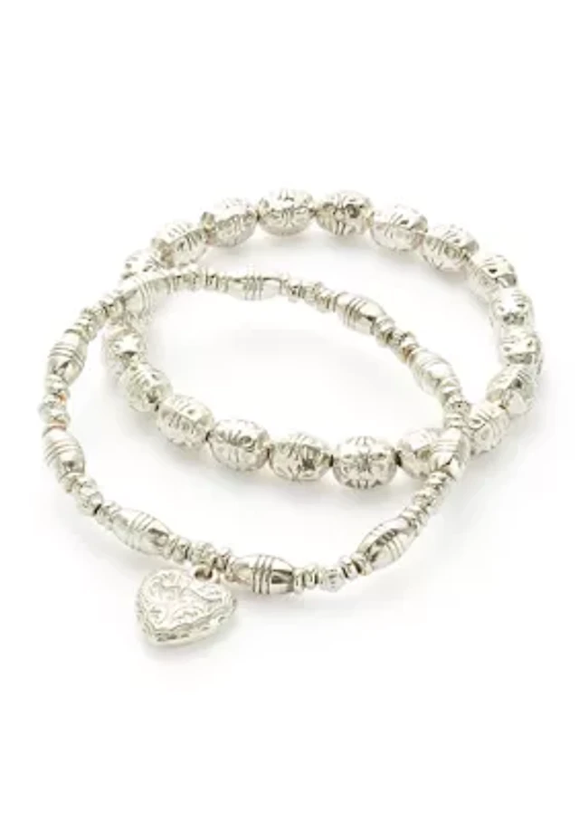 Women's Silver Tone Beaded Stretch Heart Drop Bracelet Set