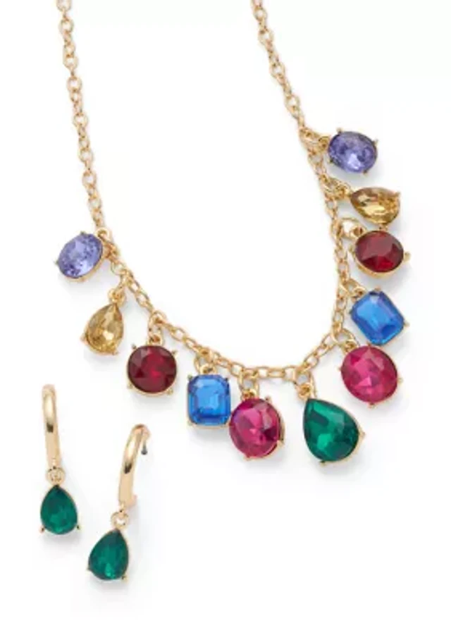 Gold Tone Drop Hoop Earrings and Shakey Frontal Necklace Set