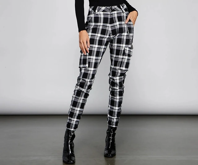 High Waist Plaid Joggers With Chain