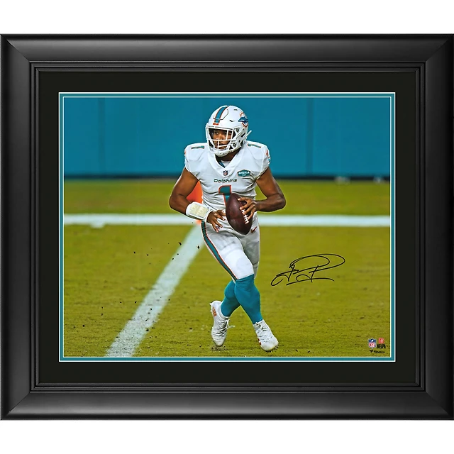 Tua Tagovailoa Miami Dolphins Framed Autographed 8" x 10" White Jersey Rolling Out Photograph