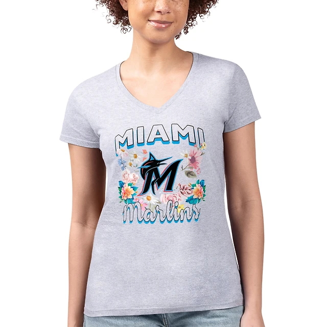Women's G-III 4Her by Carl Banks Heather Gray Miami Marlins Super-Slim Fit Lightweight Flowers Graphic V-Neck T-Shirt