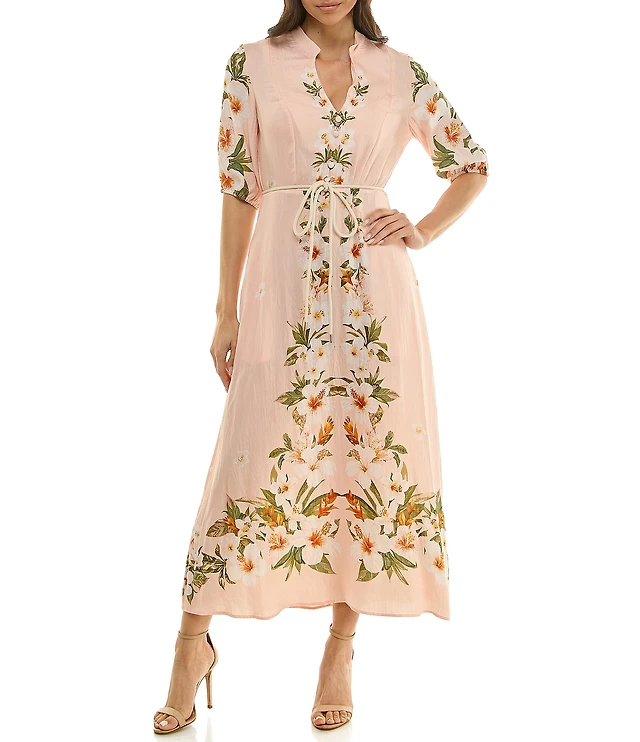 London Times Women's Collar Printed Side Tie Midi Dress