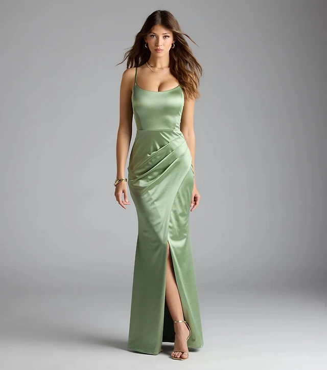 Cinderella Couture Satin Ruched Lace Up Back Side Sash Long Dress