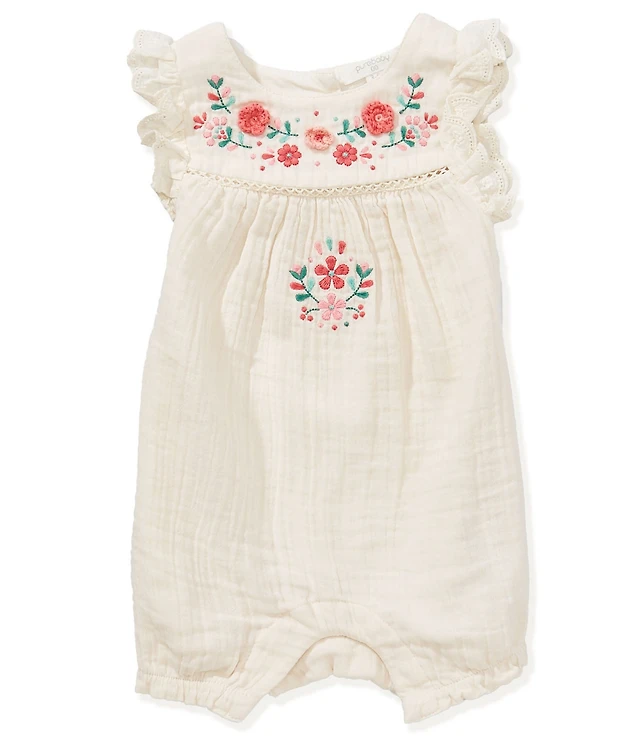 Purebaby Baby Girls Organic Cotton Flutter Sleeves Embroidered Bubble Romper