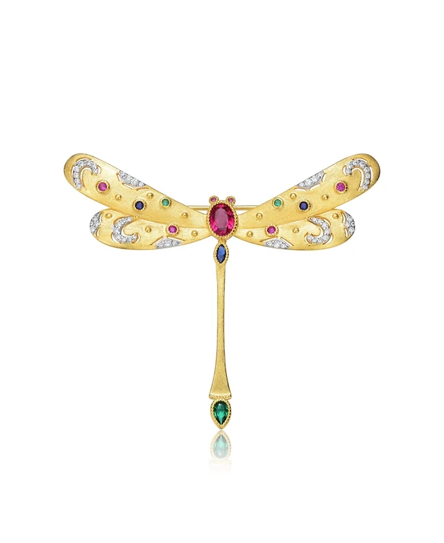 White Gold and 14K Gold Plated Red Genuine Stone Dragon Fly Pin