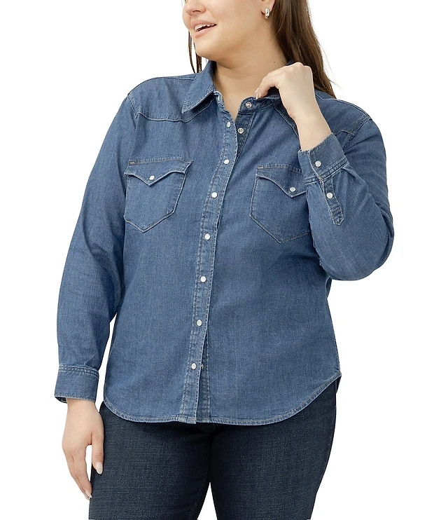 Silver Jeans Co. Plus Size Point Collar Long Sleeve Snap Front Button Denim Shirt