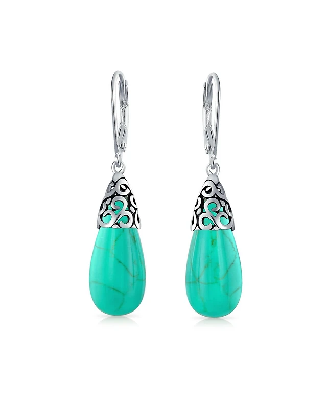 Bling Jewelry Boho Bali Style Scroll Filigree Blue Natural Turquoise Heart Shaped Dangling Earrings Oxidized Sterling Silver Lever back