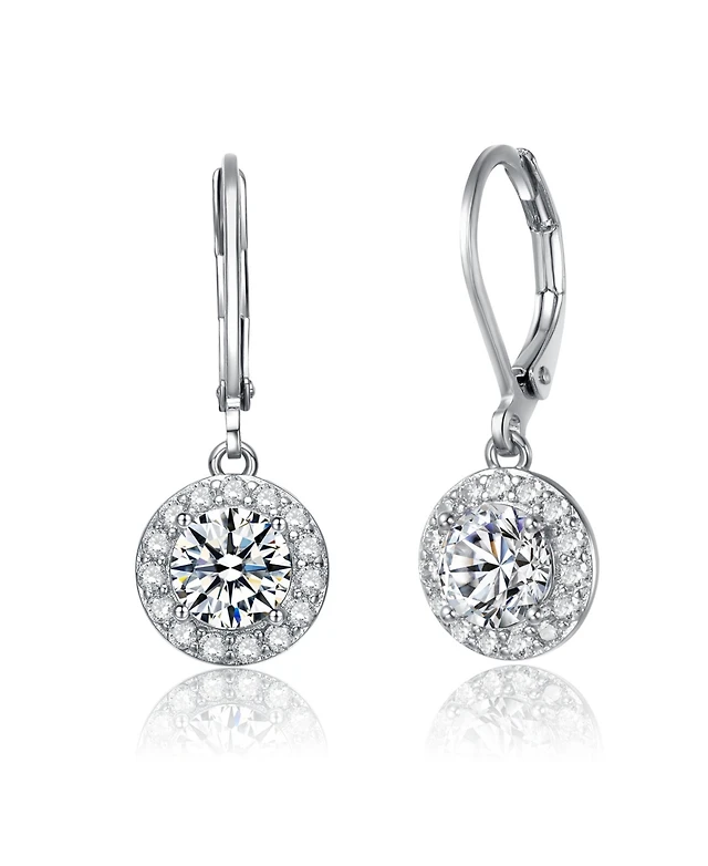 White Gold Plating with Clear Round Cubic Zirconia Leverback Dangle Earrings