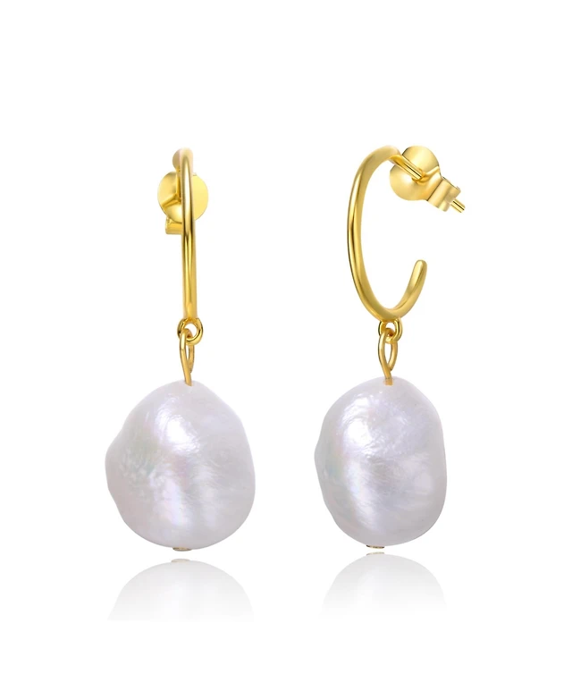 Sterling Silver 14k Yellow Gold Plated with White Coin Freshwater Pearl Drop Geometric Rippled 3D Double Dangle Earrings