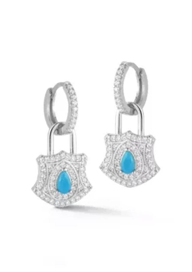 Sterling Silver CZ and Synthetic Turquoise Padlock Charm Huggie Hoop Earrings