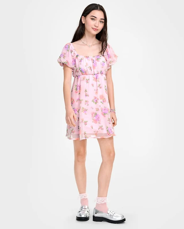 Women's Puff Sleeve Floral Print Silky Dress