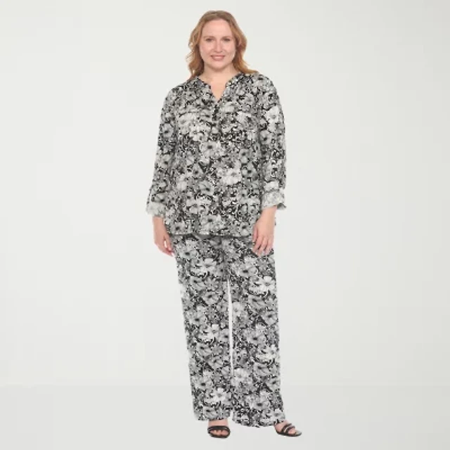 Anne Klein Womens Printed 3 4 Sleeve Boat Neck Top Printed Pull On Wide Leg Pants