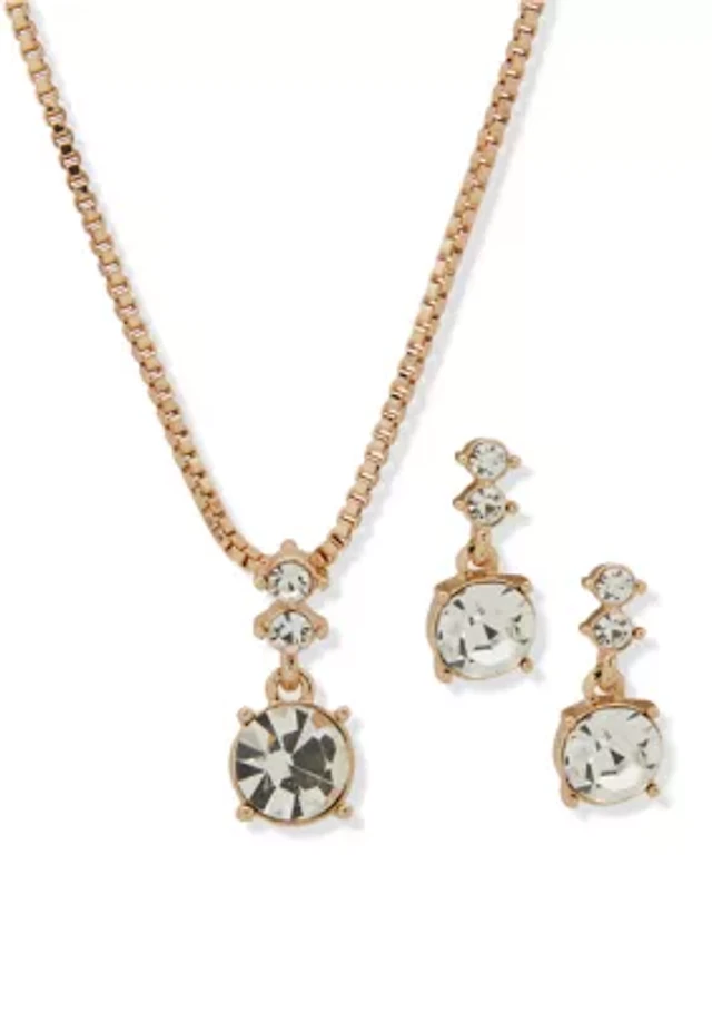 Gold Tone Gem Drop Earrings and Pendant Necklace Set