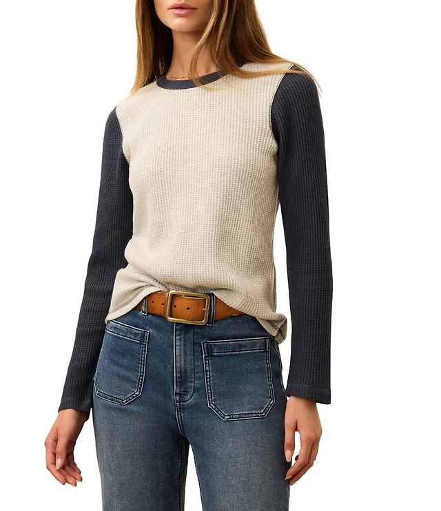 Faherty Apres Colorblock Knit Waffle Crew Neck Long Sleeve Varsity Top
