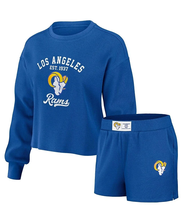 Women's Wear by Erin Andrews Royal Distressed Los Angeles Rams Waffle Knit Long Sleeve T-shirt and Shorts Lounge Set
