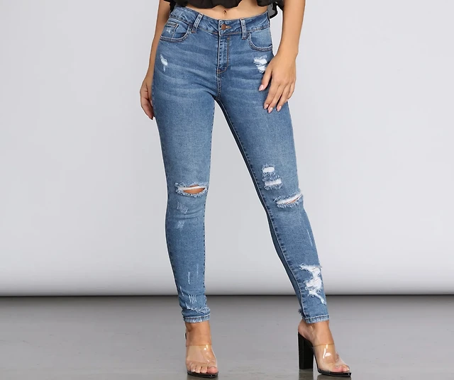 Mid Rise Medium Wash Distressed Skyscraper Jeans
