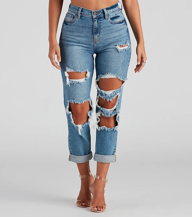 High Waisted Medium Wash Raw Hem Wide Leg Ankle Jeans