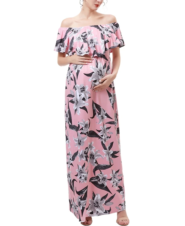 Pinkblush Maternity Light Blue Floral Chiffon Sweetheart Neck Off Shoulder Maxi Dress