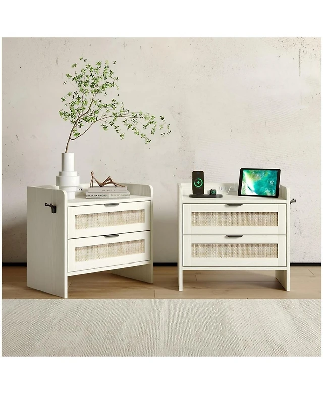 Gymax 2 Pcs Nightstand Bedside Sofa Table with Rattan Drawer for Bedroom & Living Room