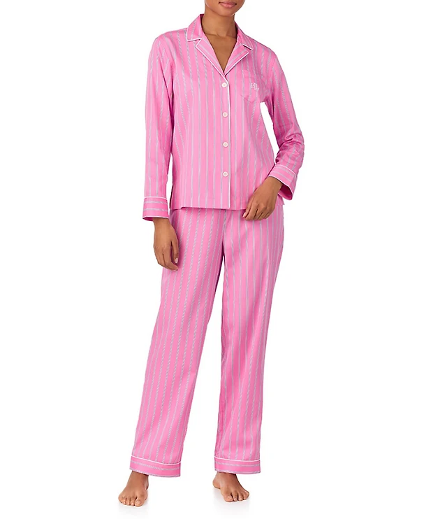 Lauren Ralph Lauren Jersey Knit Striped Print Short Sleeve Notch Collar Long Pajama Set