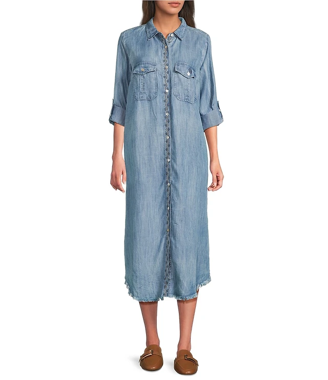 Karen Kane Petite Size Sand Wash Twill Point Collar 3/4 Ruched Sleeve Button Front Shirt Dress