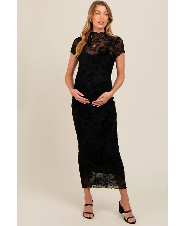 Pinkblush Black Mock Neck Front Slit Short Sleeve Maternity Maxi Dress