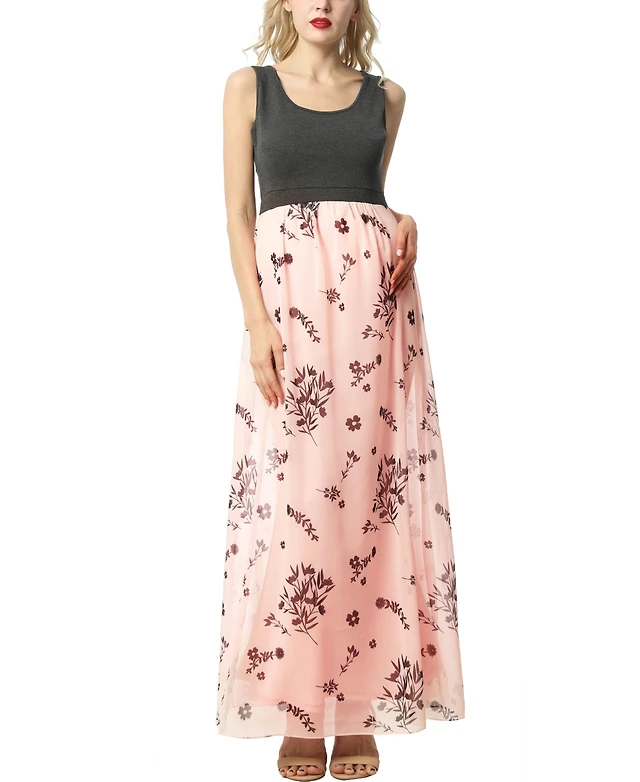 24seven Comfort Apparel Women's Maternity Brown Blush Floral Long Sleeve Maxi Dress