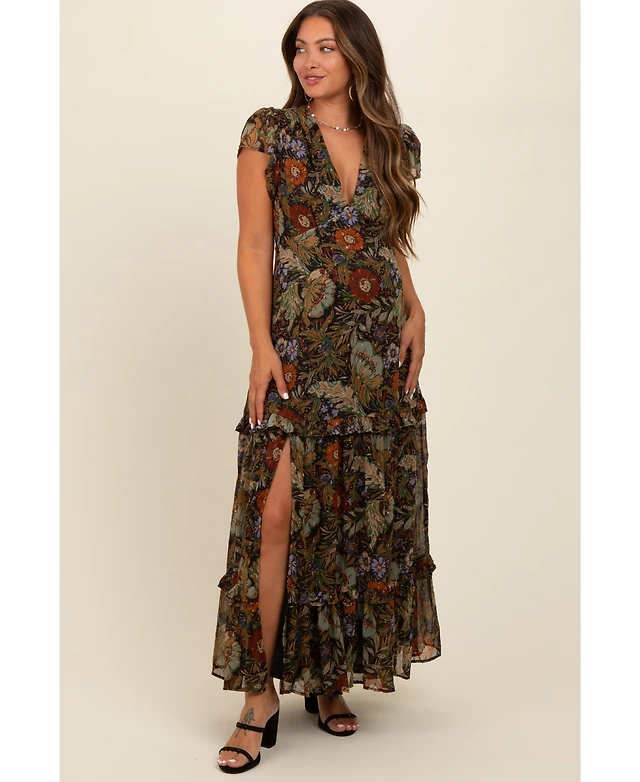 Maternity Green Floral Print Three Quarter Sleeve Side Slit Maxi Dress