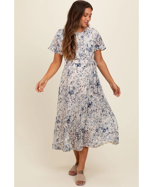Pinkblush Cream Embroidered Smocked Maternity Midi Dress
