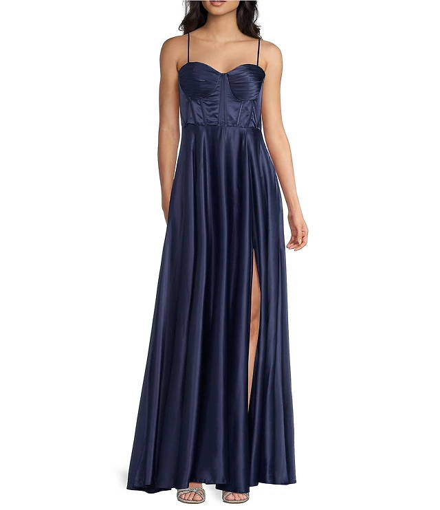B. Darlin Sweetheart Neck Pleated Bustier Side Slit Long Dress