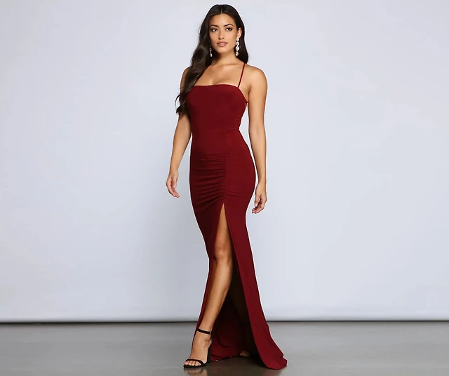 Mac Duggal Crepe Square Neck Bow Tie Strap Slit Sheath Gown