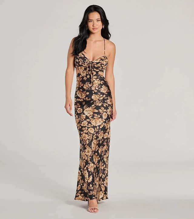 After Six Women's Dramatic Ruffle Edge Convertible Strap Metallic Pleated Maxi Dress with Floral Gold Foil Print
