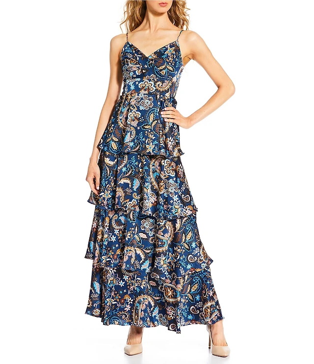 Skies Are Blue Paisley Print V-Neck Spaghetti Strapped Tiered Maxi Dress