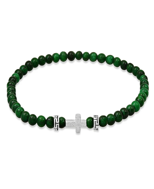 Steeltime Men's Sterling Silver Cross and Green Agate Beaded Stretch Bracelet