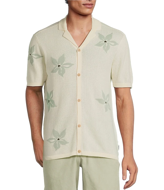 Rowm Outsider's Oasis Short Sleeve Jacquard Flower Button Front Sweater Knit Shirt