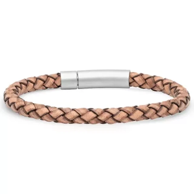 Men's Stainless Steel and Brown Leather Braid Bracelet with Fancy Clasp