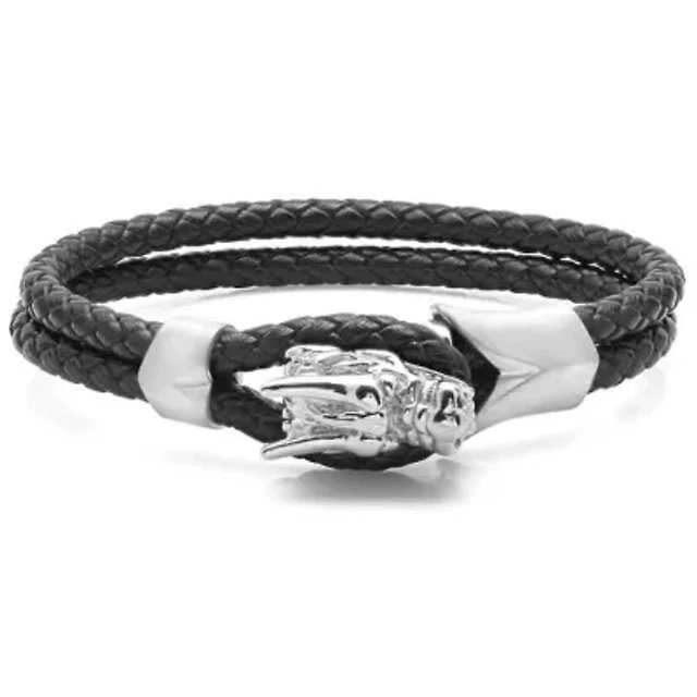 Steeltime Men's Black Braided Leather Bracelet with Stainless Steel Dragon Head Design