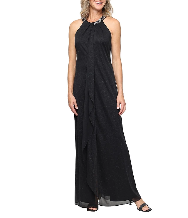 Ignite Evenings Petite Size Long Sleeveless Glitter Mesh Beaded Halter Dress